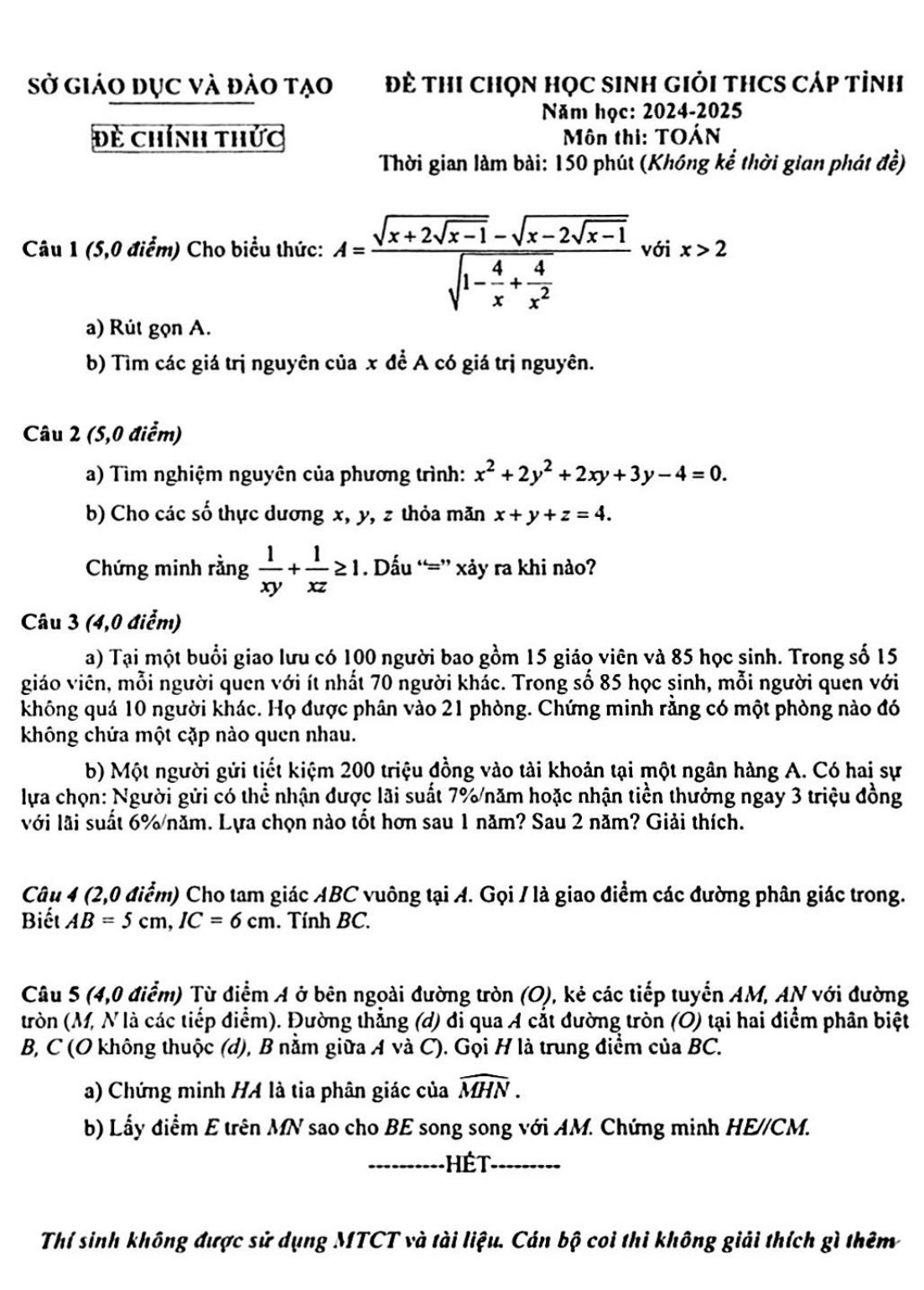 Đề chọn học sinh giỏi tỉnh Toán THCS năm 2024 – 2025 sở GD&ĐT Bình Dương