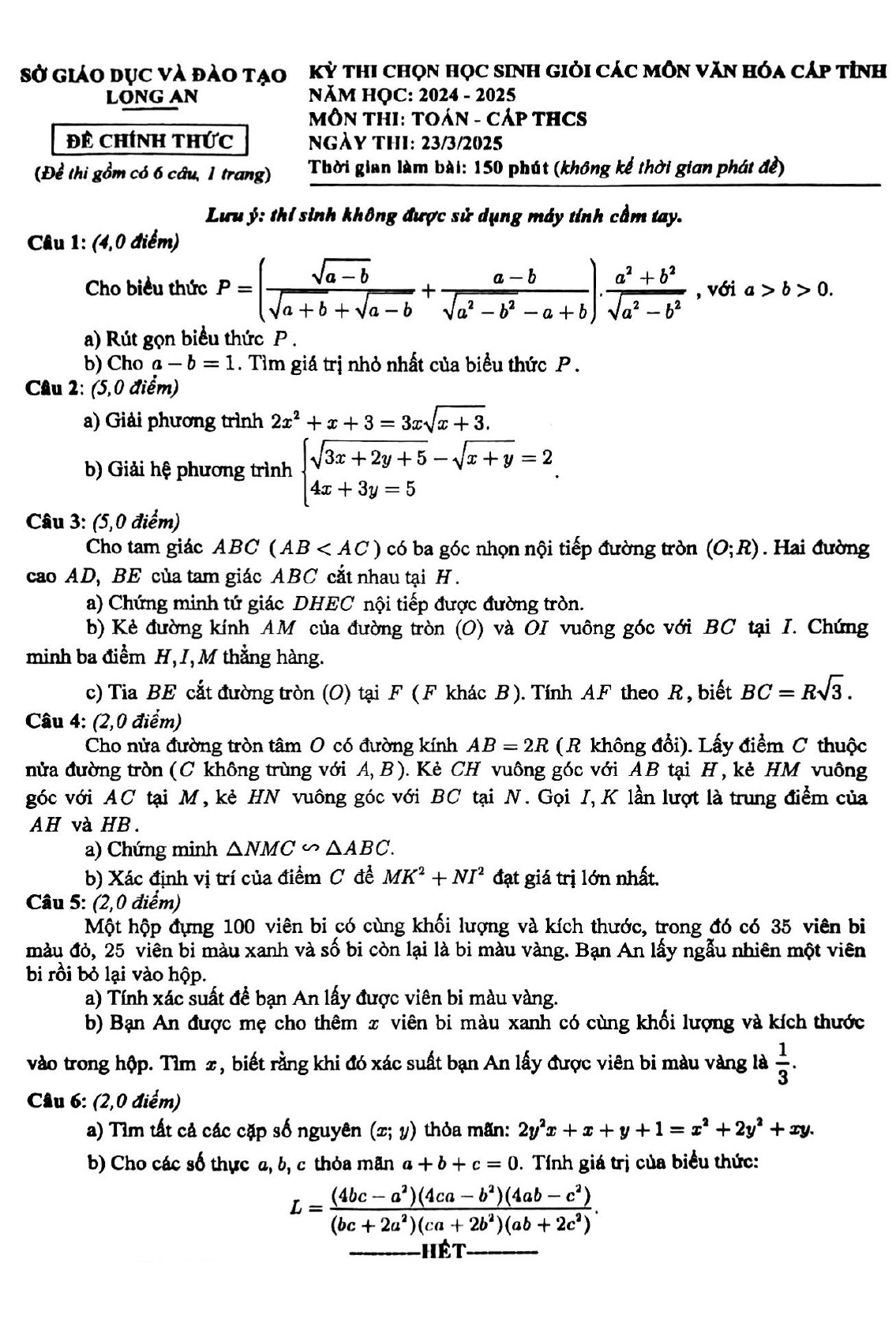 Đề chọn học sinh giỏi tỉnh Toán THCS năm 2024 – 2025 sở GD&ĐT Long An được thiết kế bám sát chương trình, giúp học sinh phát triển tư duy và kỹ năng giải toán nâng cao.
