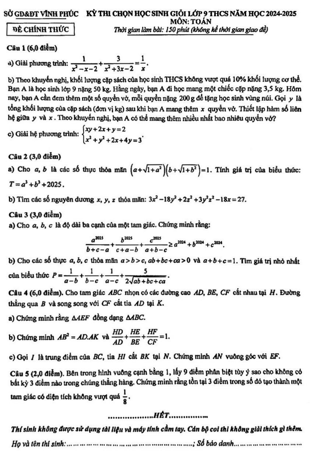 Đề chọn học sinh giỏi Toán 9 năm 2024 – 2025 sở GD&ĐT Vĩnh Phúc được thiết kế bám sát chương trình, giúp học sinh phát triển tư duy và kỹ năng giải toán nâng cao.