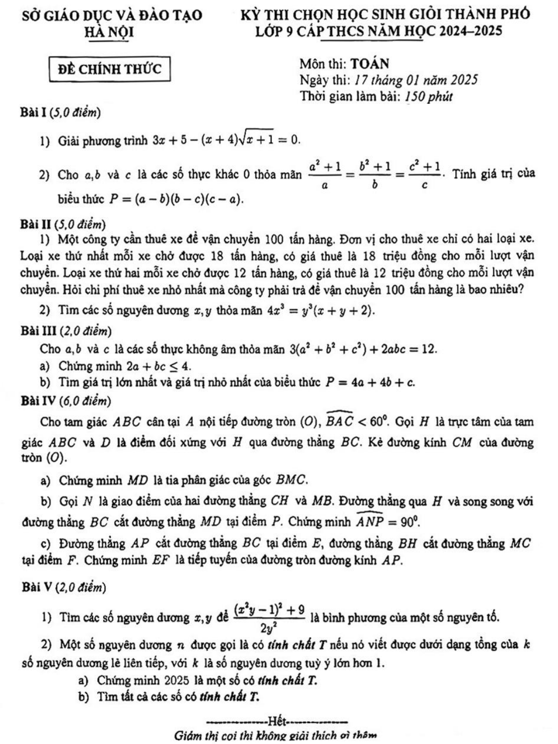 Đề chọn học sinh giỏi Toán 9 THCS năm 2024 – 2025 sở GD&ĐT Hà Nội