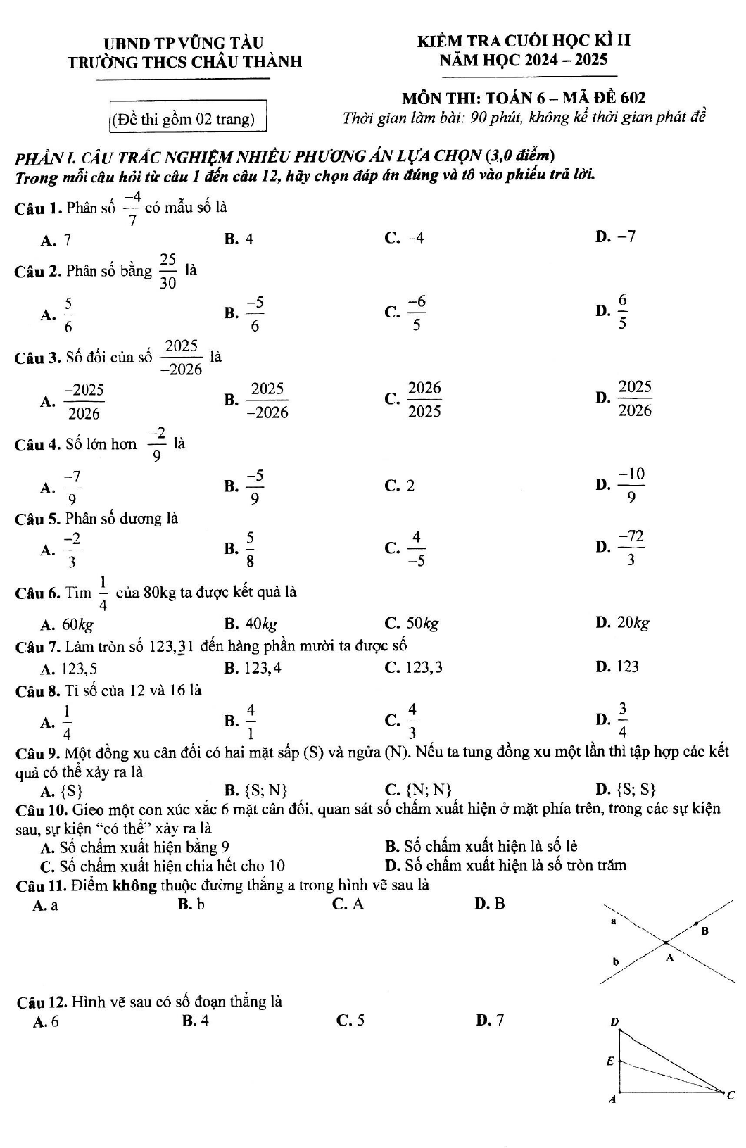 Đề cuối học kì 2 Toán 6 trường THCS Châu Thành, BR VT năm 2024 - 2025