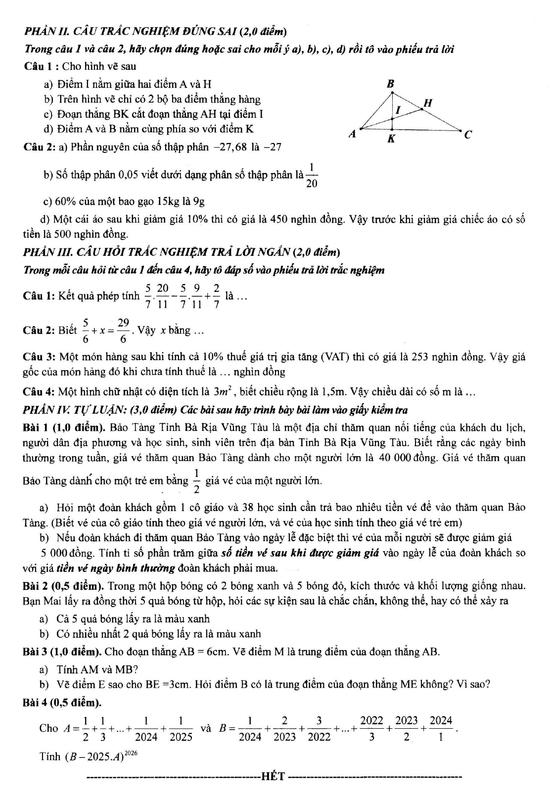 Đề cuối học kì 2 Toán 6 trường THCS Châu Thành, BR VT năm 2024 - 2025 với cấu trúc trắc nghiệm và tự luận, cho các em học sinh ôn tập, chuẩn bị cho kì thi cuối học ki 2 lớp 6 sắp tới. Đề thi cấu trúc 30% trắc nghiệm nhiều phương án lựa chọn + 20% trắc nghiệm đúng sai + 20% trắc nghiệm trả lời ngắn + 30% tự luận, thời gian làm bài 90 phút. Mời các em thử sức.