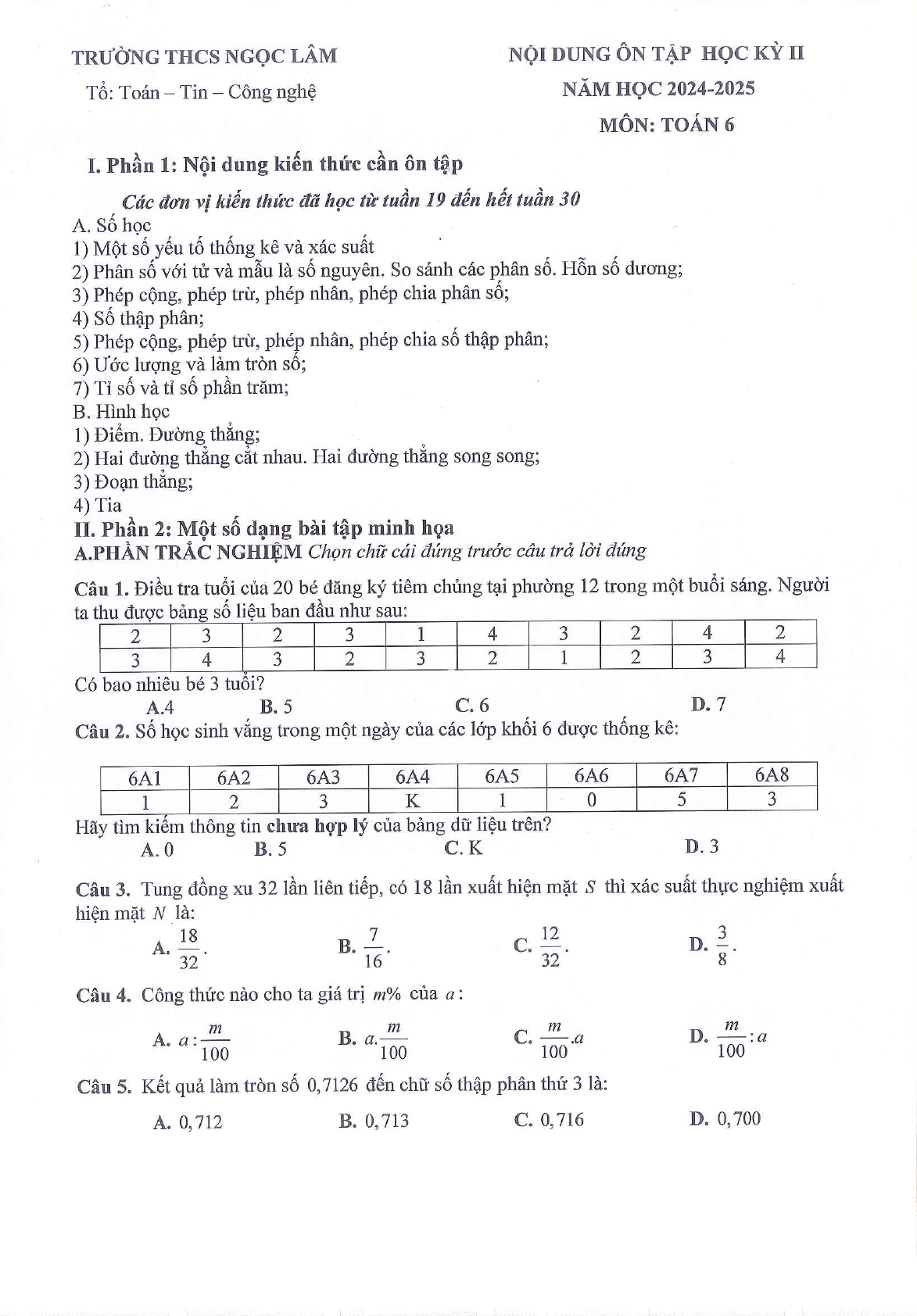 Đề cương ôn tập cuối kì 2 Toán 6 trường THCS Ngọc Lâm, Hà Nội năm 2024 - 2025