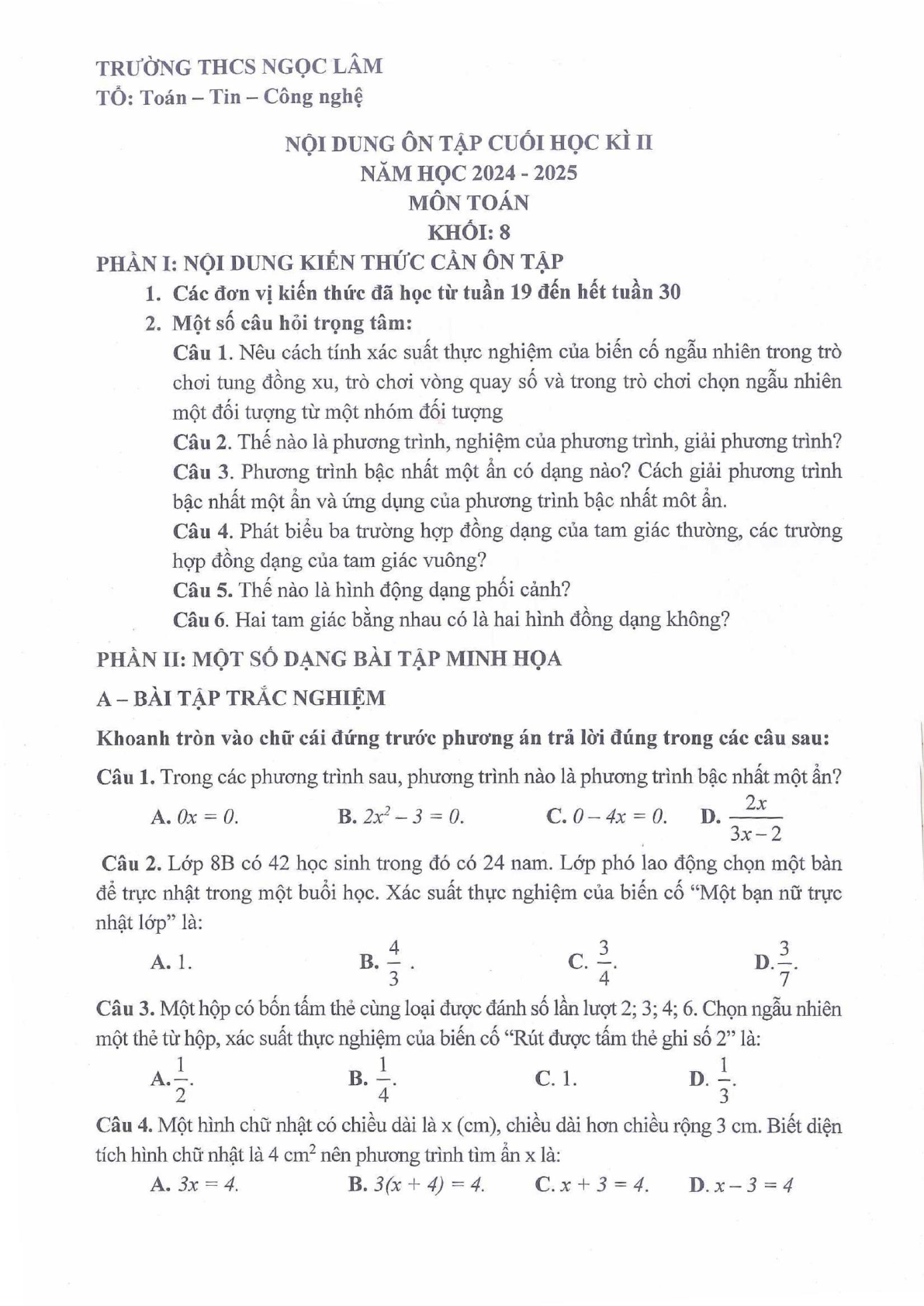 Đề cương ôn tập cuối kì 2 Toán 8 trường THCS Ngọc Lâm, Hà Nội năm 2024 - 2025 gồm các dạng bài tập trắc nghiệm và tự luận theo cấu trúc mới, thầy cô có thể tham khảo ra đề và ôn luyện cho học sinh. Đây cũng là tài liệu hay cho các em học sinh ôn tập, chuẩn bị cho kì thi sắp tới.