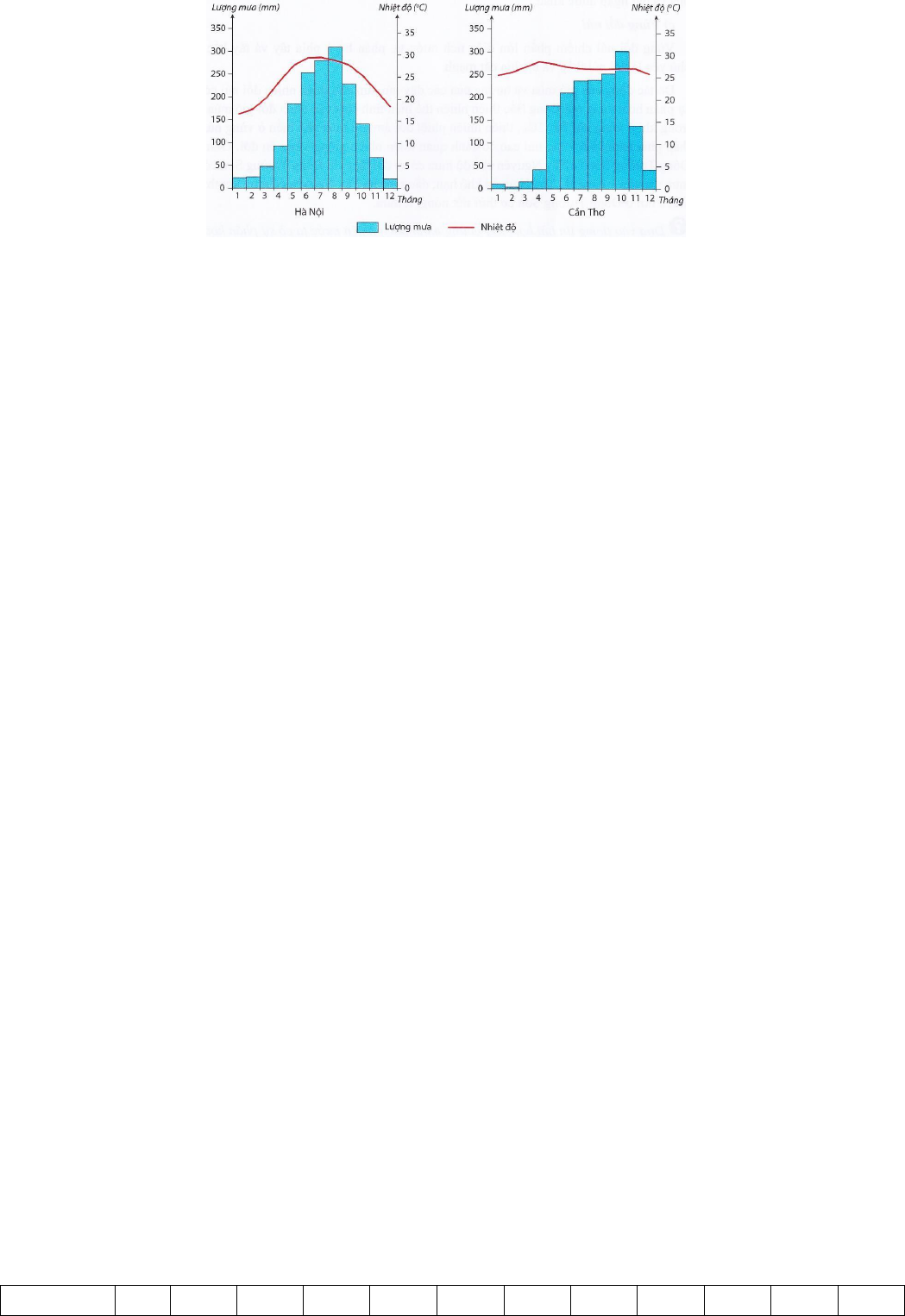 Câu 10. Cho biểu đồ nhiệt độ, lượng mưa ở Hà Nội và Cần Thơ, xác định nhận định đúng/sai ở các đáp án
