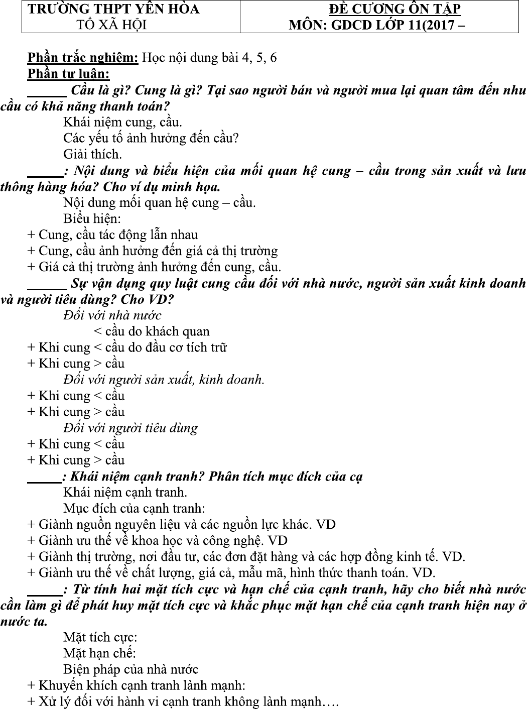 Đề cương ôn tập học kì 1 GDCD 11 năm 2017 - 2018 trường THPT Yên Hòa - Hà Nội