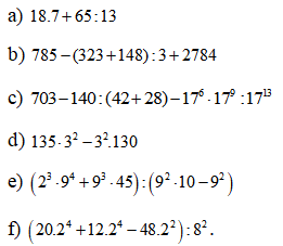 a) 3. 52 + 15. 22 – 26:2 b) 53. 2 – 100 : 4 + 23. 5 c) 62 : 9 + 50. 2 – 33. 3 d) 32. 5 + 23. 10 – 81:3 e) 513 : 510 – 25. 22 f) 20 : 22 + 59 : 58 g) 100 : 52 + 7. 32 h) 84 : 4 + 39 : 37 + 50 i) 29 – [16 + 3. (51 – 49)] |