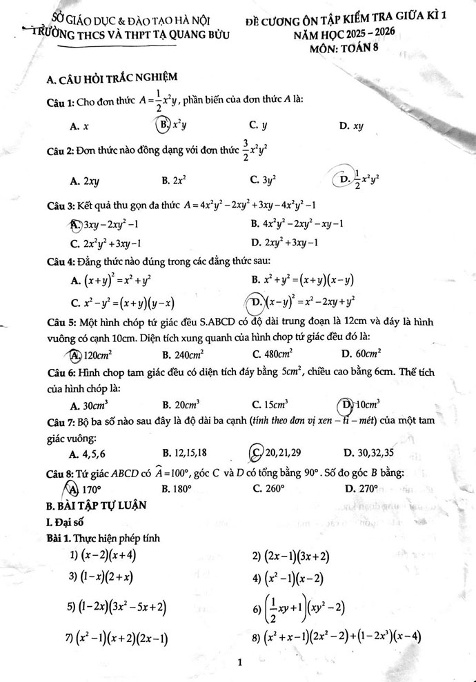 Đề cương ôn tập kiểm tra giữa kì I Toán 8 trường THCS Tạ Quang Bửu năm 2025 - 2026