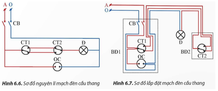 Mạch đèn cầu thang: 1 CB, 2 CT 3 cực; 1 bóng đèn, 1 OC