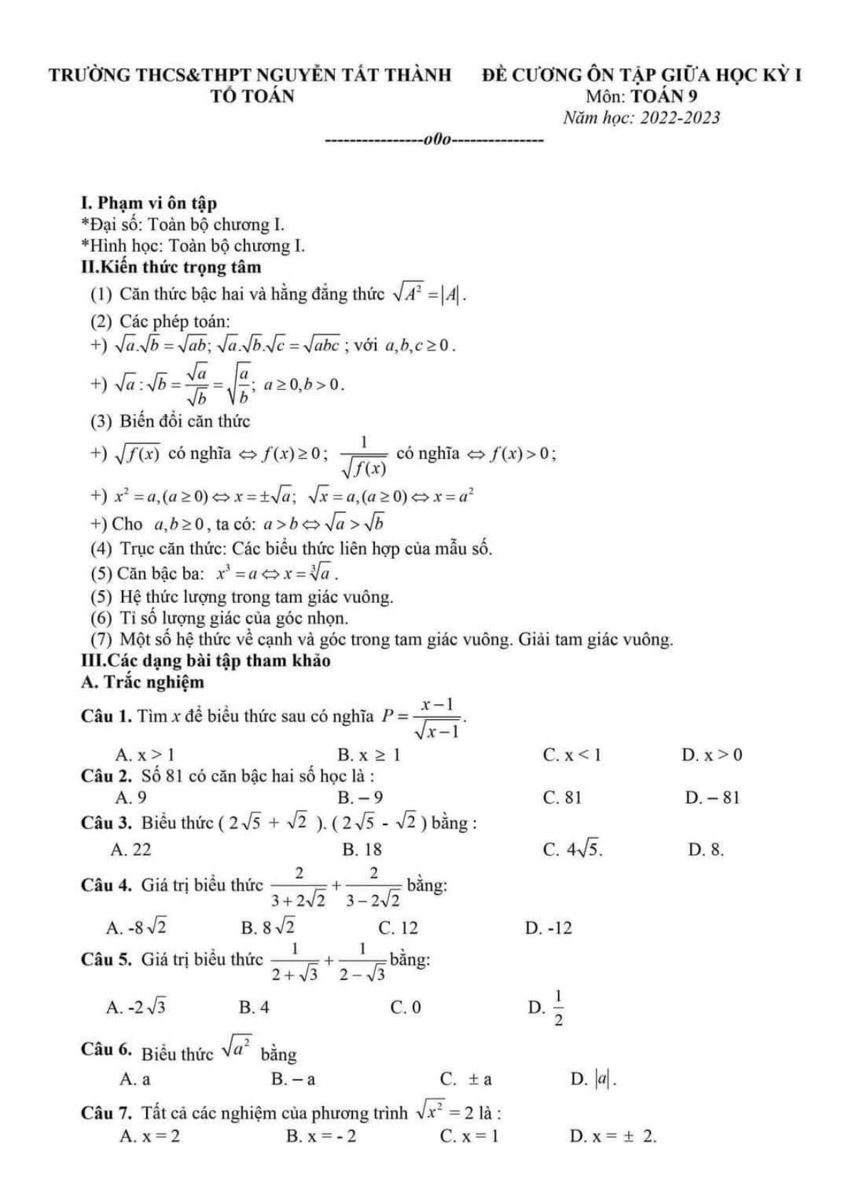 Đề cương ôn tập giữa kì 1 Toán 9 năm học 2022 - 2023 trường Nguyễn Tất Thành, Hà Nội tổng hợp bài tập trắc nghiệm và tự luận Toán 9 trong nửa đầu kỳ 1, giúp các em ôn tập các dạng bài tập Toán 9. Đây là tài liệu hay cho các em học sinh lên kế hoạch ôn tập, chuẩn bị cho kì thi giữa kì 1 sắp tới đạt kết quả cao.