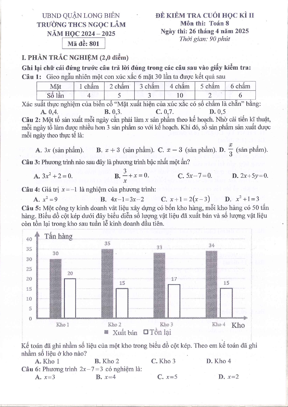 Đề học kì 2 Toán 8 trường THCS Ngọc Lâm, Hà Nội năm 2024 - 2025 với cấu trúc trắc nghiệm và tự luận, thời gian làm bài 90 phút. Đây là tài liệu hay cho các em học sinh ôn tập, chuẩn bị cho kì thi học kì 2 lớp 8 sắp tới. Tài liệu có đáp án đi kèm cho các em so sánh đối chiếu sau khi làm xong. Mời các bạn tham khảo.
