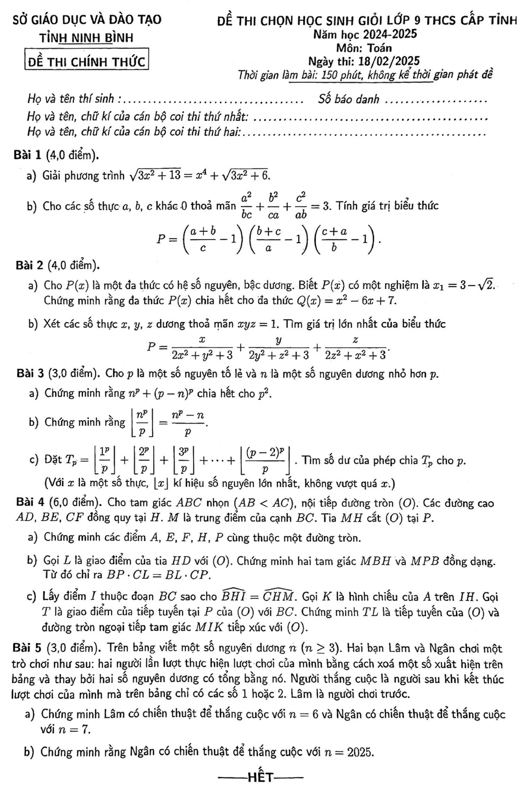 Đề học sinh giỏi Toán 9 cấp tỉnh năm 2024 – 2025 sở GD&ĐT Ninh Bình