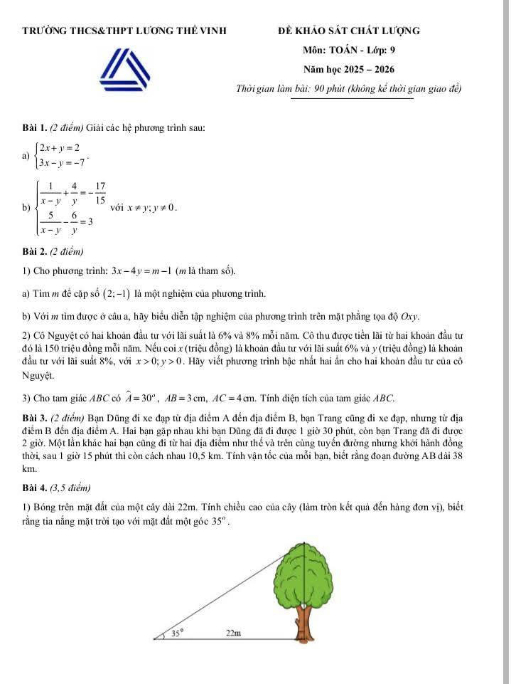Đề khảo sát chất lượng đầu năm Toán 9 Trường THCS Lương Thế Vinh năm 2025-2026