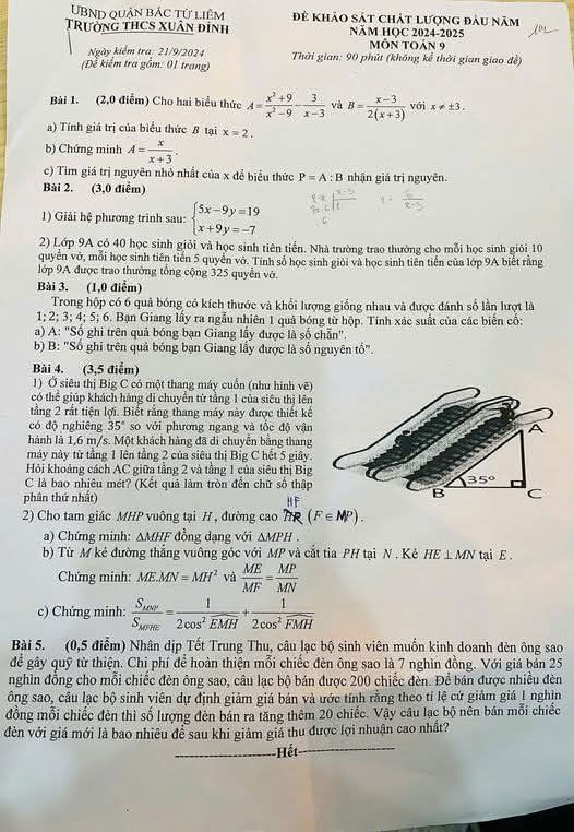 Đề khảo sát chất lượng đầu năm Toán 9 Trường THCS Xuân Đỉnh năm 2024-2025