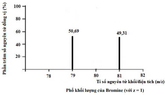 Bromine (Br, Z = 35) là chất lỏng màu nâu đỏ, dễ bay hơi, mùi khó chịu và độc. Do nguyên tố này có tính ổn định thấp hơn khi tiếp xúc với ánh sáng. Do đó hóa chất hồ bơi này không thực sự phù hợp để xử lý nước bể bơi ngoài trời. Thay vào đó chỉ nên sử dụng cho những bể bơi trong nhà hay bể bơi có mái che. Dựa vào phổ khối lượng của Bromine trong tự nhiên. Hãy tính nguyên tử khối trung bình của Bromine