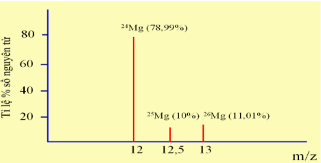 Magnesium (Mg) là một trong những nguyên tố vi lượng đóng vai trò quan trọng của cơ thể, giúp xương chắc khỏe, tim khỏe mạnh và lượng đường trong máu bình thường. Tỉ lệ phần trăm số nguyên tử các đồng vị của magnesium được xác định theo phổ khối lượng như hình dưới đây (biết rằng điện tích z của các ion đồng vị của magnesium đều bằng +2). Tính nguyên tử khối trung bình của magnesium.