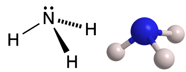 Phân tử ammonia được tạo bởi một nguyên tử nitrogen liên kết với ba nguyên tử hydrogen và có dạng hình học là chóp tam giác.