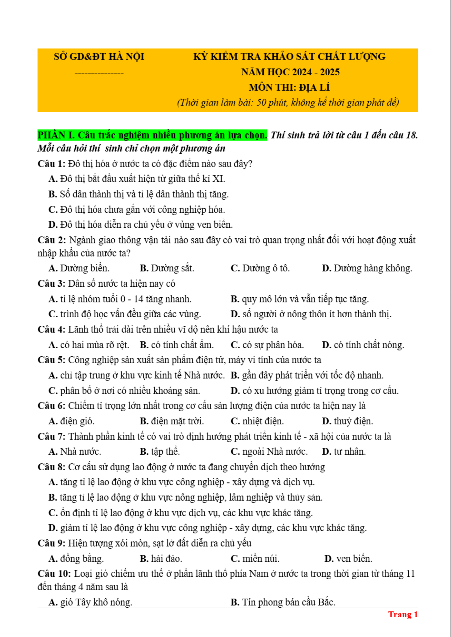 Đề khảo sát Địa lí 12 năm 2025 Sở GD&ĐT Hà Nội
