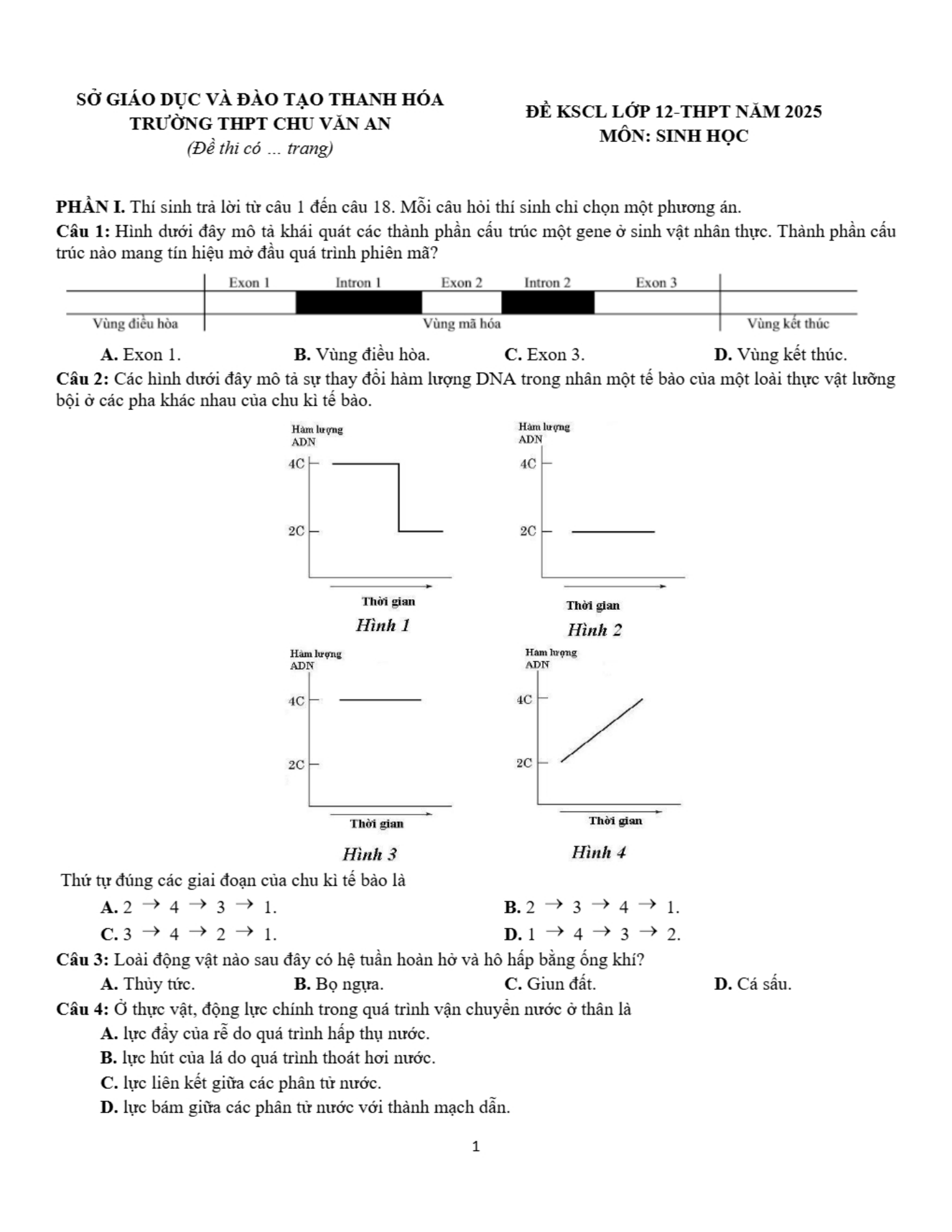 Đề khảo sát chất lượng Sinh 12 năm 2025 trường Chu Văn An, Thanh Hóa