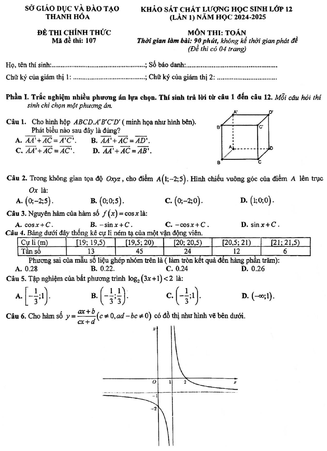 Đề khảo sát Toán 12 năm 2025 lần 1 Sở GD&ĐT Thanh Hóa