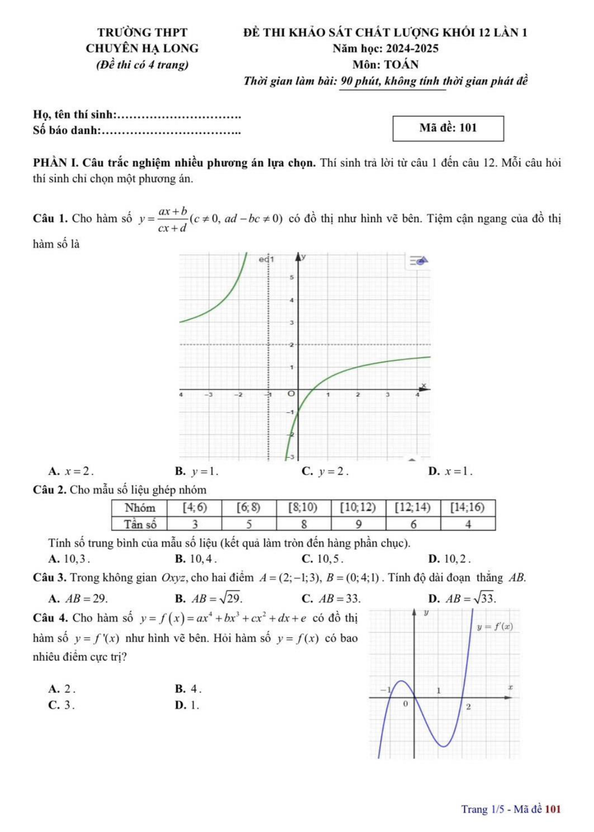 Đề khảo sát Toán 12 năm 2025 lần 1 trường THPT chuyên Hạ Long, Quảng Ninh