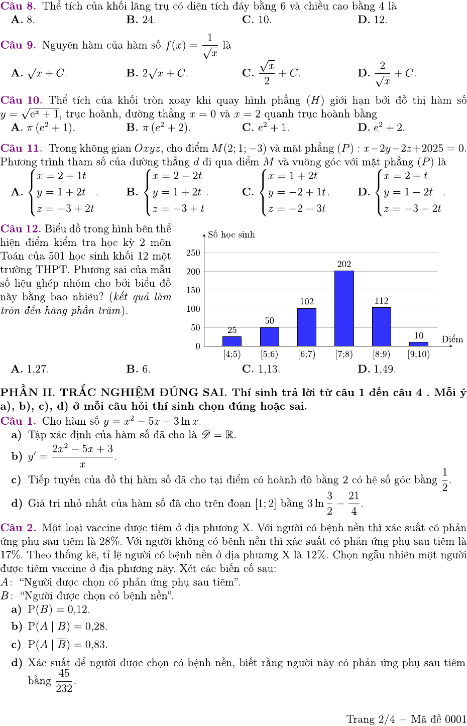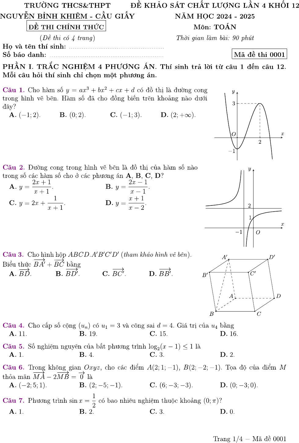 Đề khảo sát Toán 12 năm 2025 lần 4 trường THPT Nguyễn Bỉnh Khiêm, Hà Nội có đáp án là tài liệu hữu ích giúp bạn đọc có thể trau dồi nội dung kiến thức, chuẩn bị cho kì thi khảo sát chất lượng lớp 12 nhé. Đề gồm có 12 câu hỏi trắc nghiệm nhiều phương án lựa chọn, 4 câu hỏi trắc nghiệm đúng sai và 6 câu hỏi trả lời ngắn. Thí sinh làm đề trong thời gian 90 phút. Đề có đáp án và lời giải chi tiết kèm theo. Mời các bạn cùng theo dõi chi tiết bài viết dưới đây.