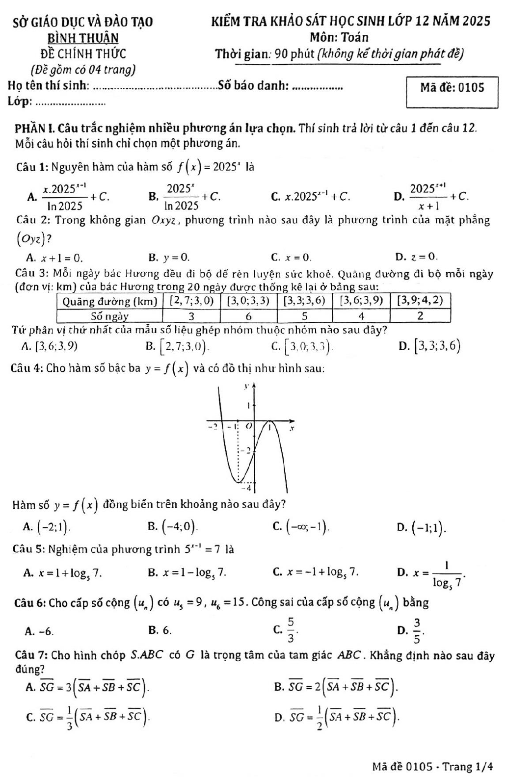 Đề khảo sát Toán 12 năm 2025 Sở GD&ĐT Bình Thuận