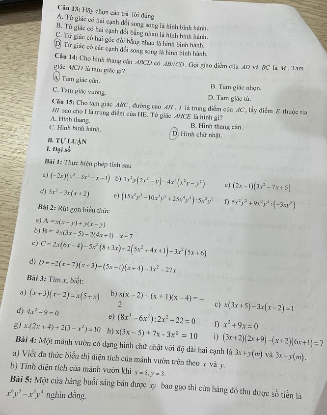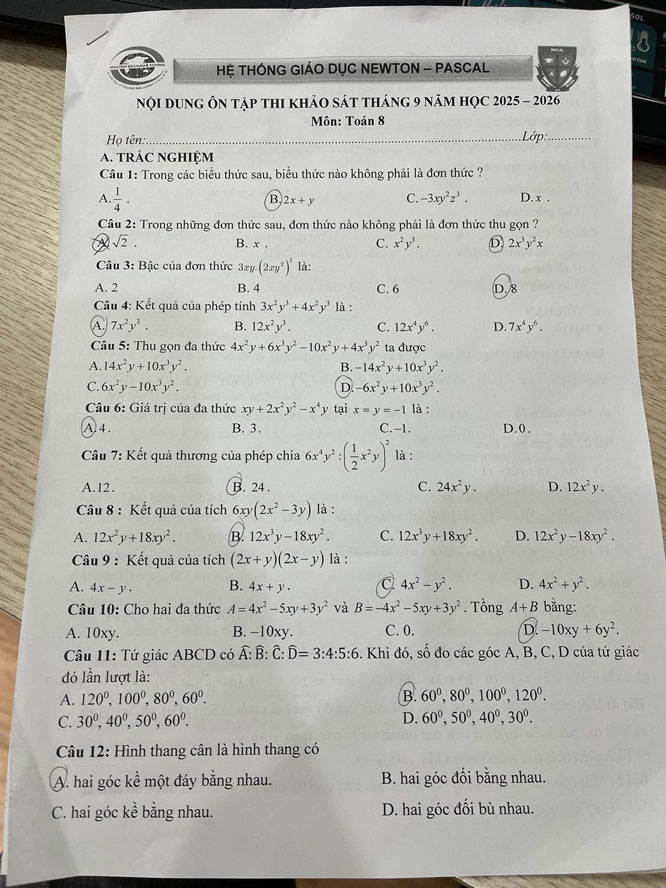 Đề khảo sát Toán 8 của trường Newton – Pascal tháng 9 được xây dựng chặt chẽ theo chương trình THCS, nhằm đánh giá toàn diện năng lực học sinh. Bài kiểm tra không chỉ giúp củng cố kiến thức nền tảng mà còn là cơ hội để các bạn rèn luyện kỹ năng tư duy logic và khả năng vận dụng kiến thức vào giải quyết vấn đề. Với cấu trúc đề thi đa dạng, bao gồm cả câu hỏi trắc nghiệm và tự luận, đề thi giúp học sinh làm quen với các dạng bài thường gặp, từ đó chuẩn bị tốt hơn cho các kỳ thi quan trọng. Đây là một tài liệu hữu ích để các bạn tự ôn tập và kiểm tra trình độ bản thân, mời thử sức.