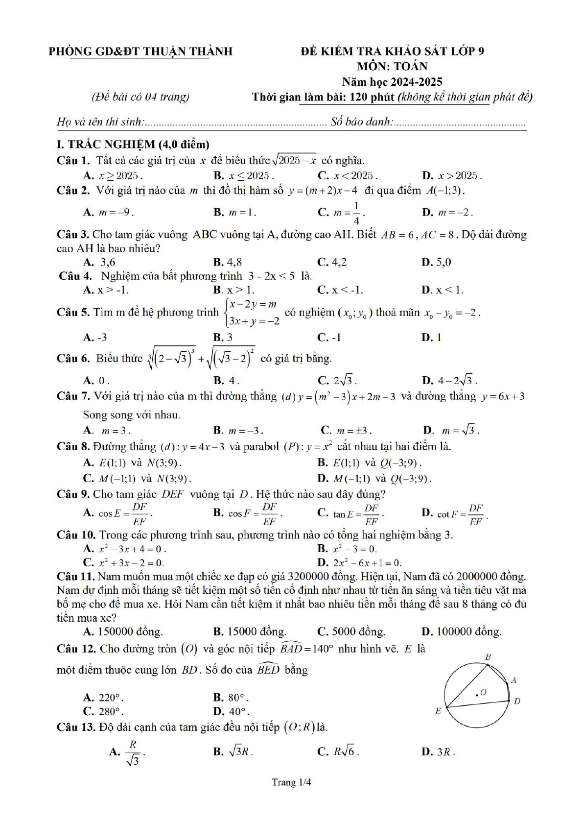 Đề khảo sát Toán 9 phòng GD&ĐT Thuận Thành, Bắc Ninh năm 2024 - 2025