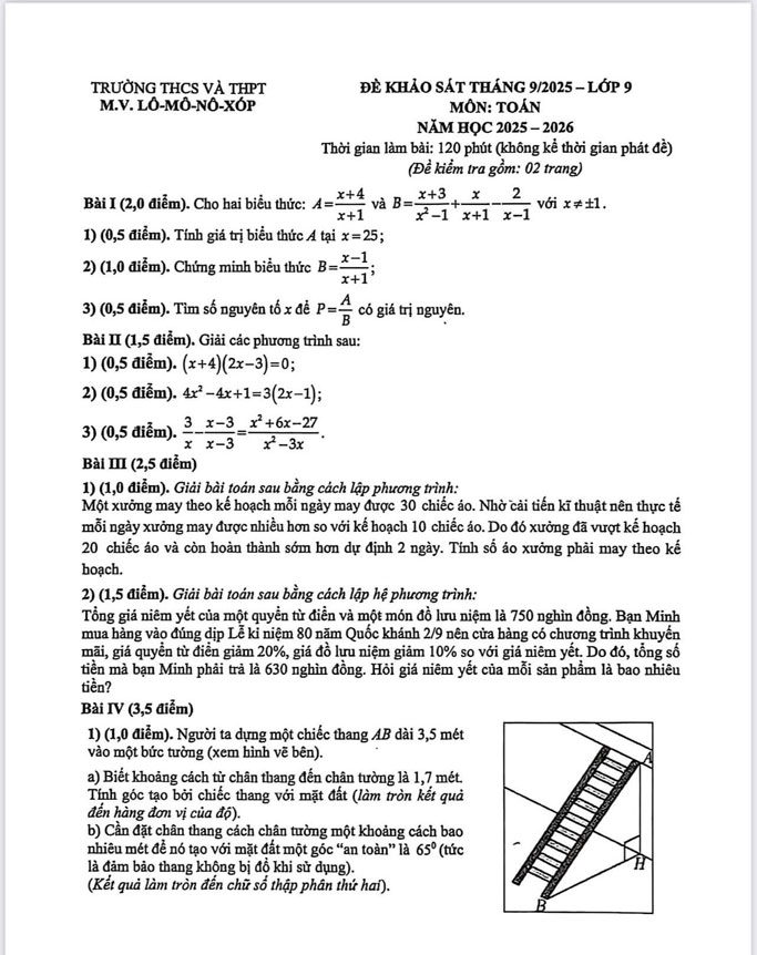 Đề khảo sát Toán 9 tháng 9 năm 2025 trường M.V. Lômônôxốp – Hà Nội