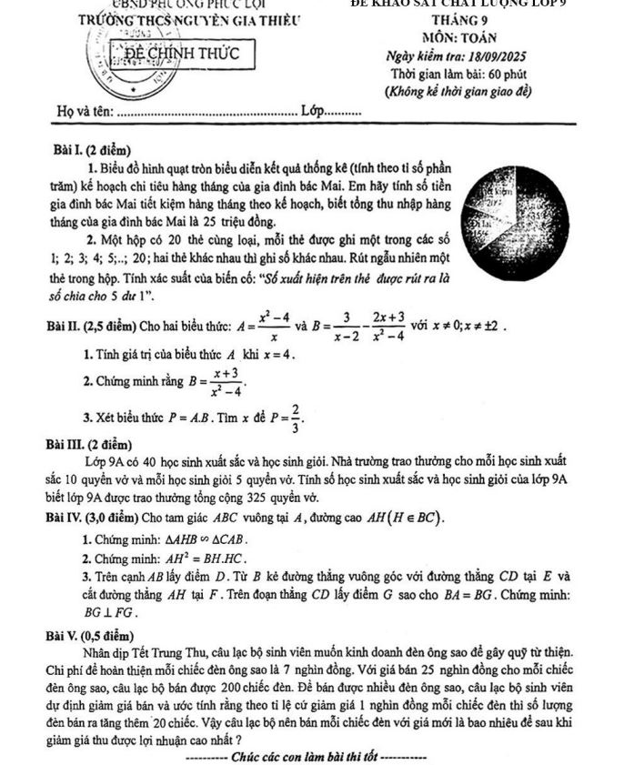 Đề khảo sát Toán 9 tháng 9 năm 2025 trường THCS Nguyễn Gia Thiều – Hà Nội