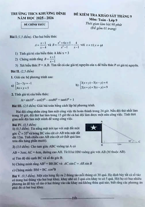 Đề khảo sát Toán 9 trường THCS Khương Đình tháng 9 năm 2025