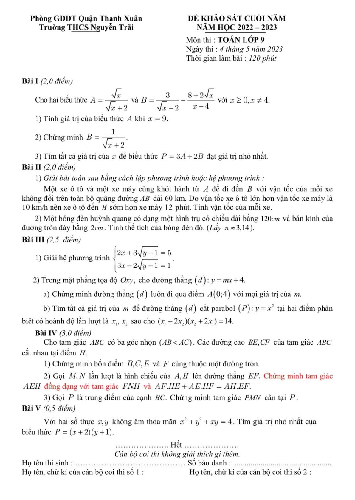 Đề khảo sát Toán 9 trường THCS Nguyễn Trãi, Hà Nội năm 2022 - 2023