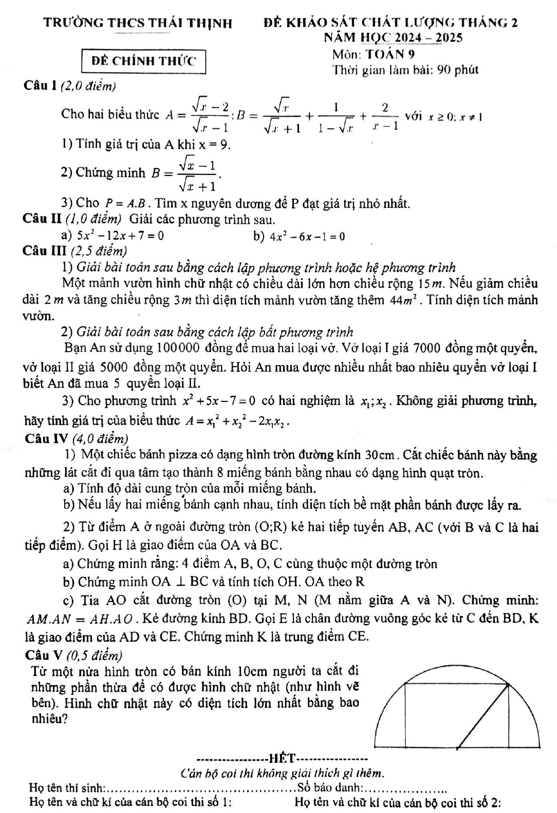 Đề khảo sát Toán 9 trường THCS Thái Thịnh tháng 2 năm 2025 (có đáp án)