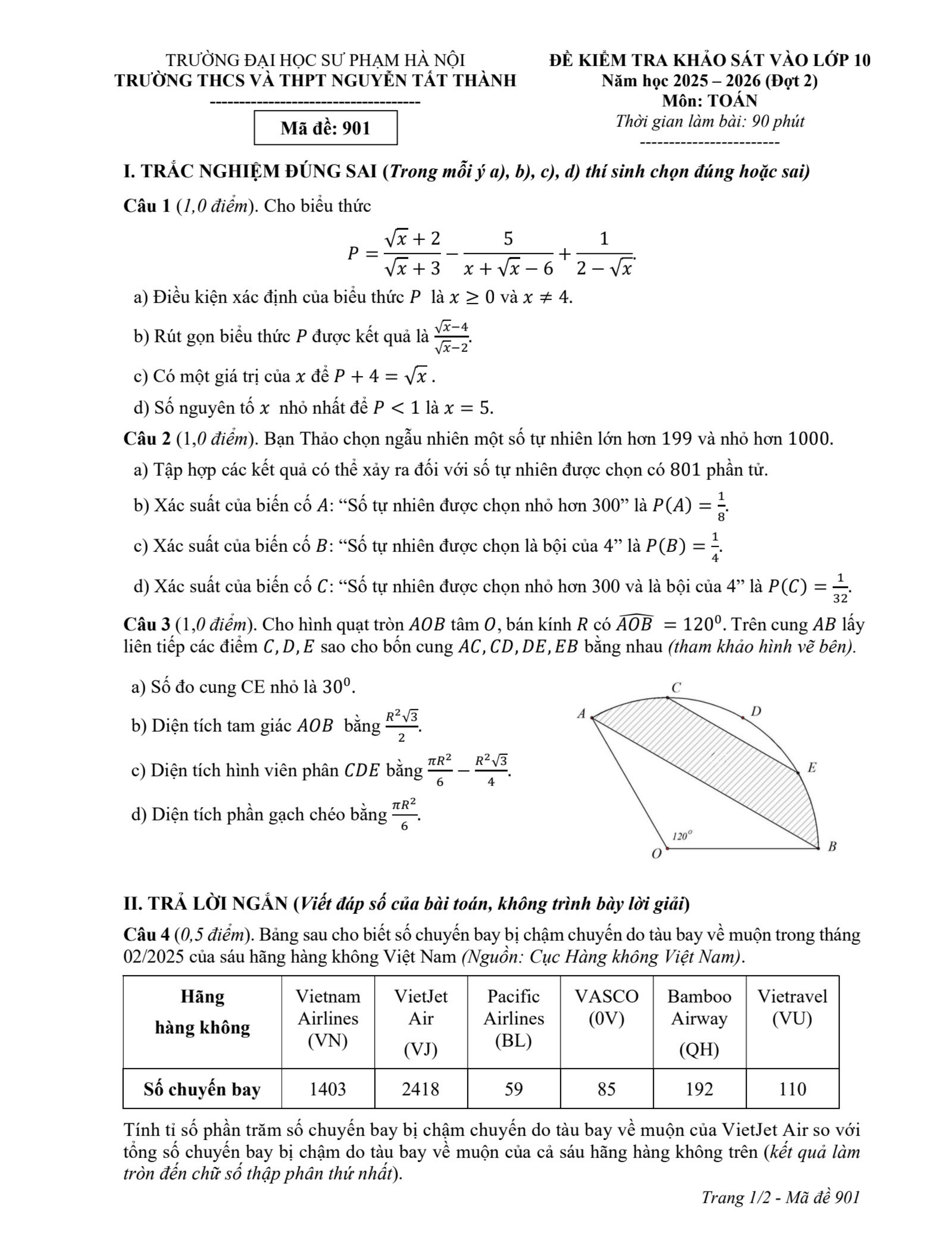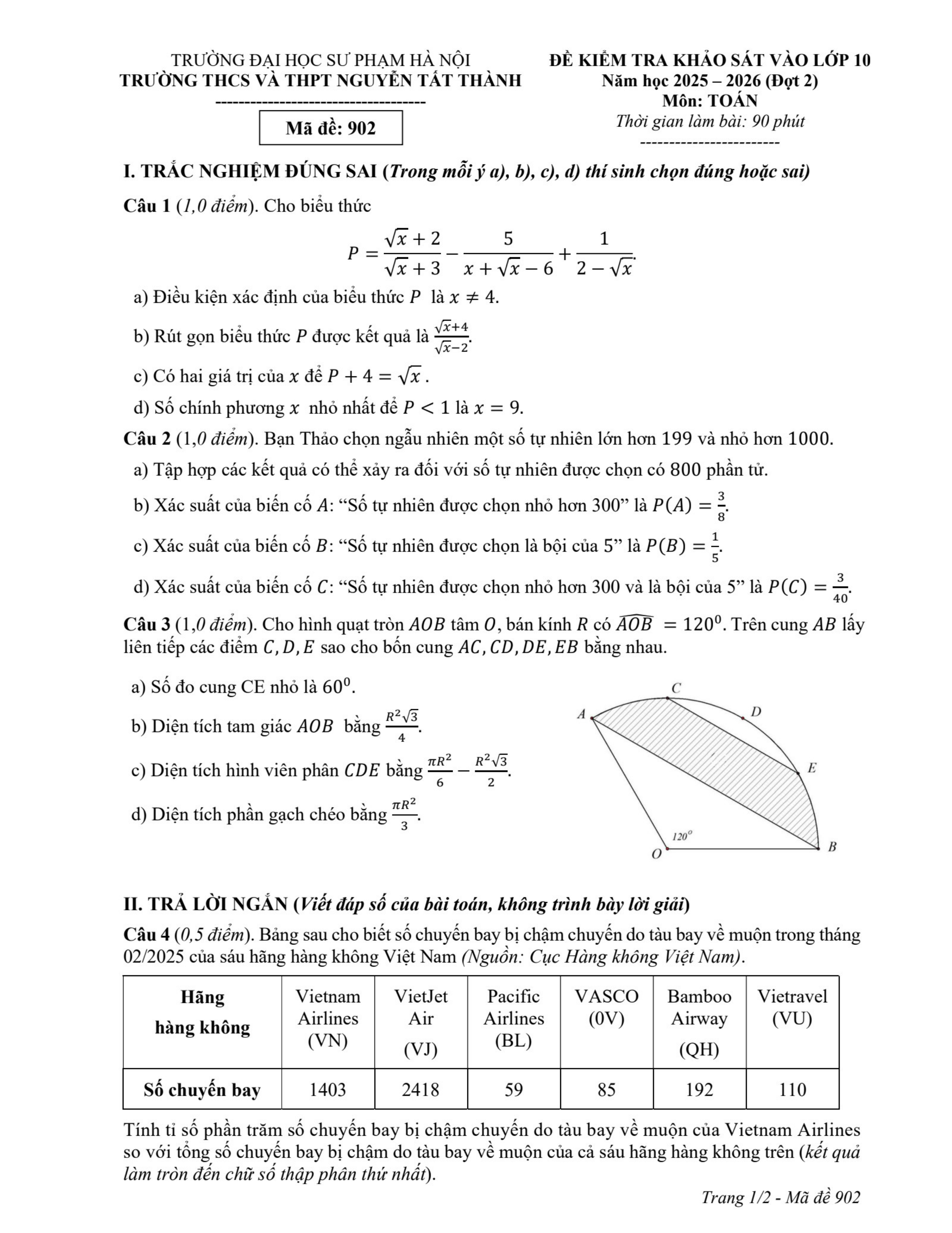 Đề khảo sát Toán vào lớp 10 đợt 2 trường Nguyễn Tất Thành, Hà Nội năm 2025 - 2026