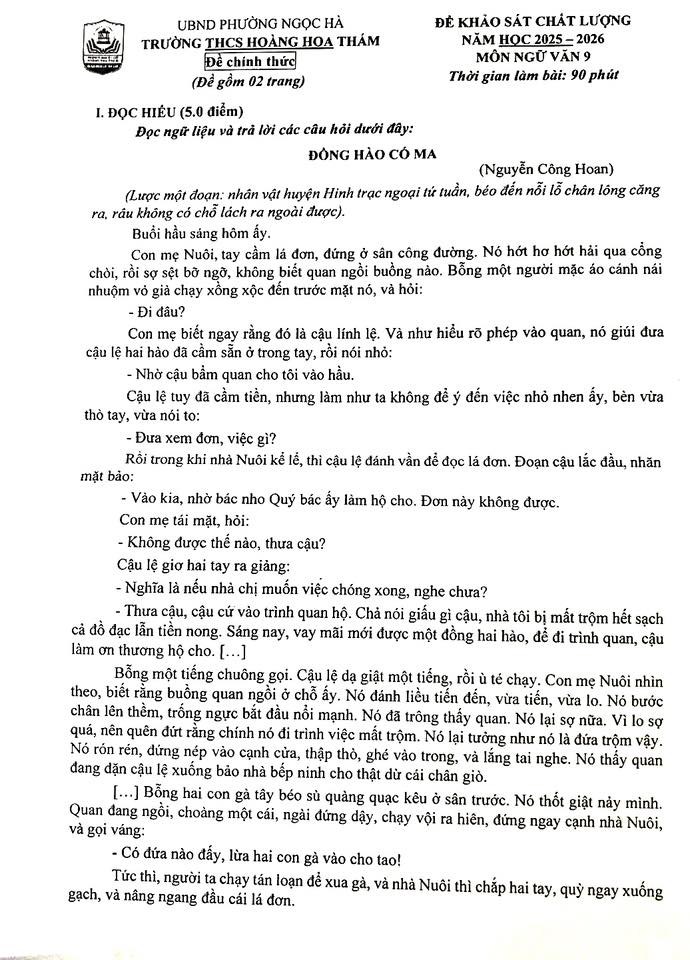 Đề khảo sát Văn 9 Trường THCS Hoàng Hoa Thám, Hà Nội năm 2025 - 2026