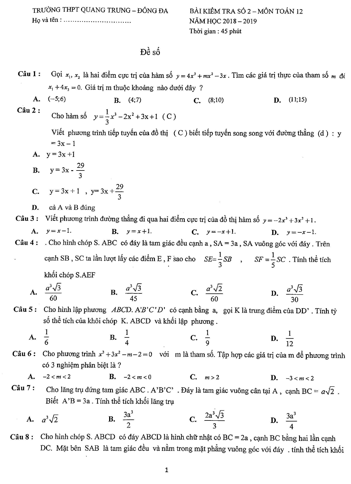 Đề kiểm tra 1 tiết Toán 12 năm 2018 - 2019 trường THPT Quang Trung - Hà Nội bài số 2