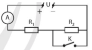 Đặt một hiệu điện thế U vào hai đầu đoạn mạch có sơ đồ như hình dưới, trong đó có điện trở R1 = 5 Ω, R2 = 10 Ω. Số chỉ ampe kế khi công tắc K đóng lớn hơn hay nhỏ hơn bao nhiêu lần so với khi công tắc K mở?