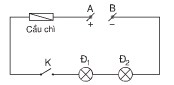 Trong đoạn mạch nối tiếp, tại bất kì điểm nào của đoạn mạch chỉ có một dây dẫn đi qua. Vậy điều kiện để đèn 1 sáng là công tắc K đóng, cầu chì không đứt, dây tóc hai đèn không bị đứt.