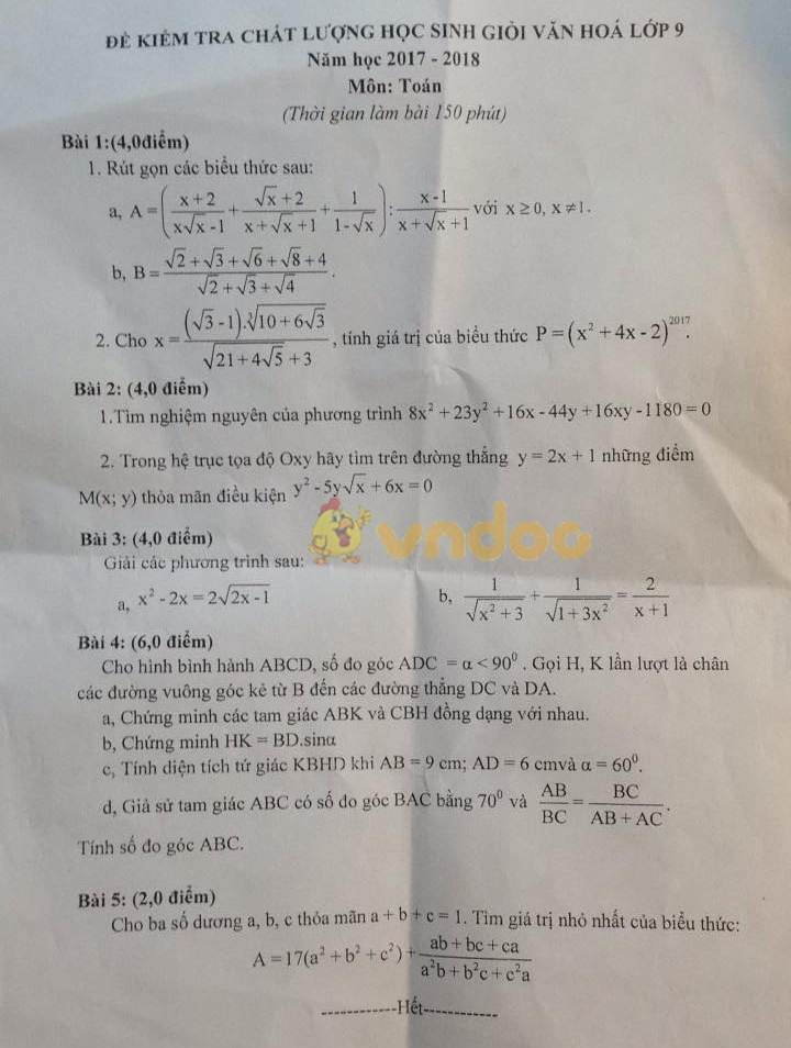 Để kiểm tra chất lượng học sinh giỏi môn Toán lớp 9 năm 2017 - 2018