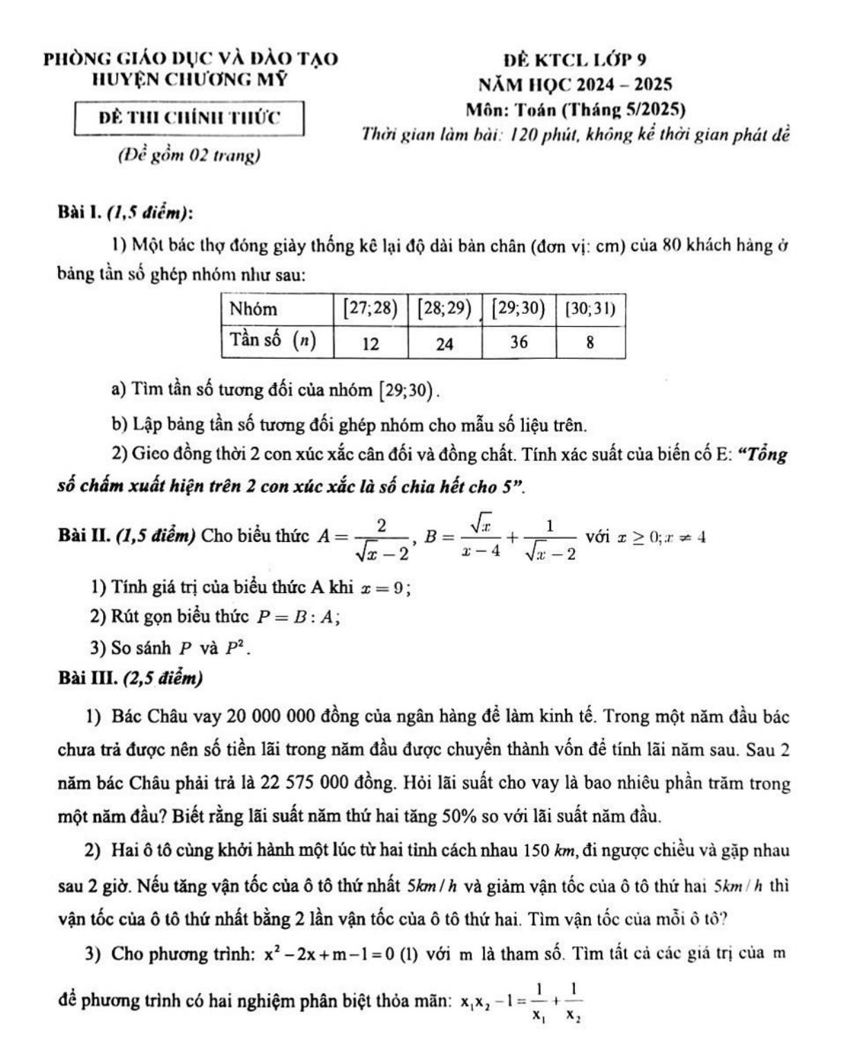 Đề kiểm tra chất lượng Toán 9 tháng 5 năm 2025 phòng GD&ĐT Chương Mỹ, Hà Nội