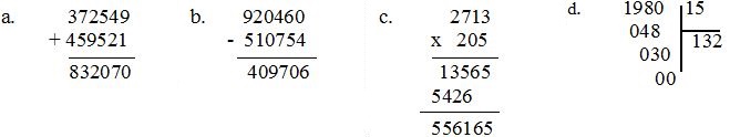 A.372549 + 459521 B. 920460 - 510754 C. 2713 x 205 D. 1980 : 15