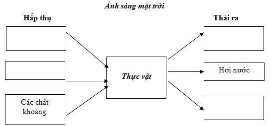 8. (1 điểm): Viết tên các chất còn thiếu (nước, khí các- bô- níc; các chất khoáng khác; khí ô xi) vào chỗ trống để hoàn thành “ Sơ đồ trao đổi thức ăn ở thực vật” dưới đây: