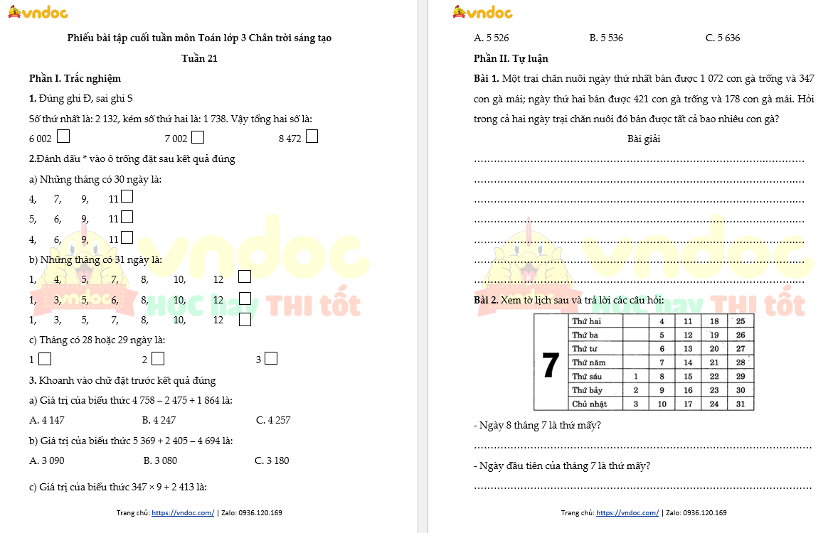 >> Tham khảo: Bài tập cuối tuần Toán lớp 3 Chân trời sáng tạo - Tuần 21 (nâng cao)