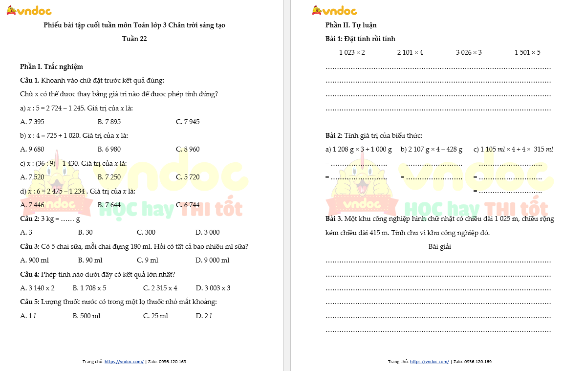 >> Tham khảo: Bài tập cuối tuần Toán lớp 3 Chân trời sáng tạo - Tuần 22 (nâng cao)