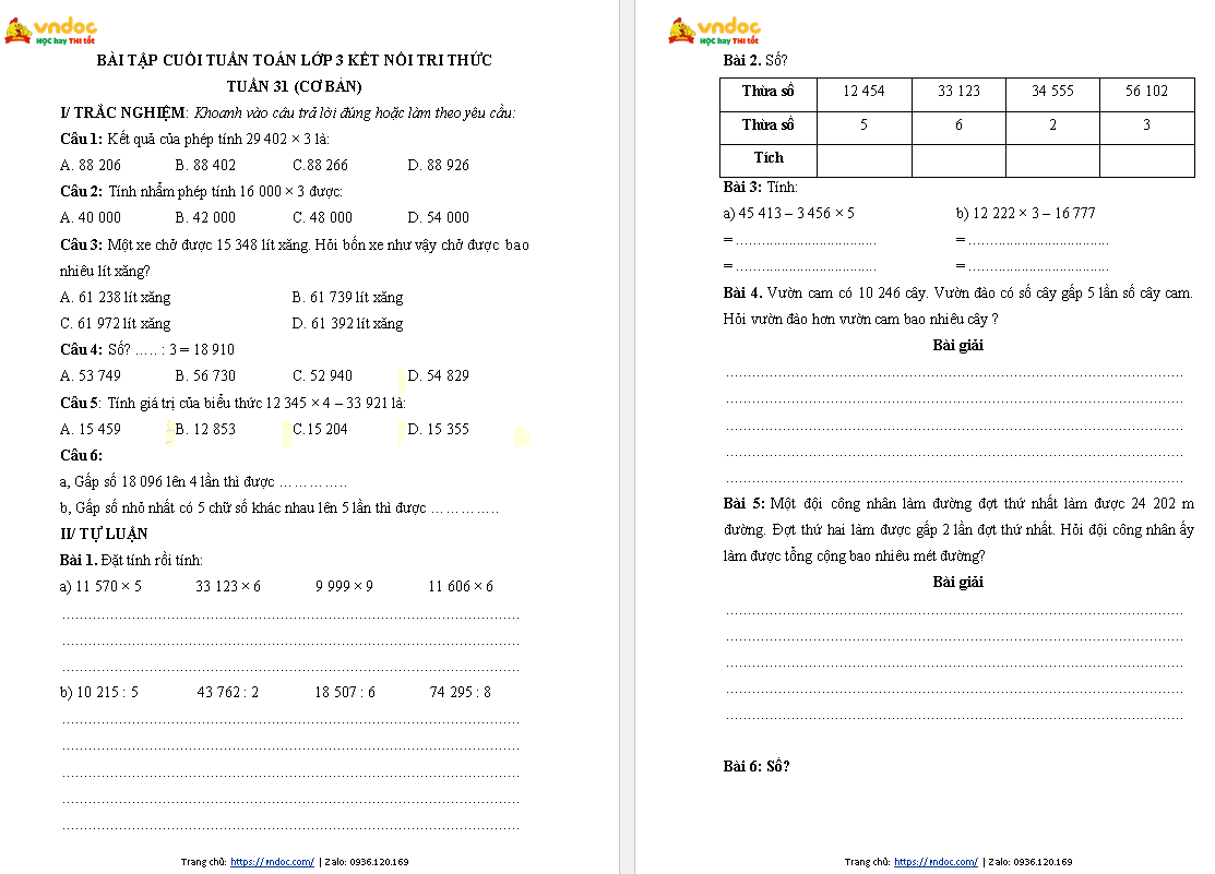 Bài tập cuối tuần Toán lớp 3 Kết nối tri thức - Tuần 31 (cơ bản) do VnDoc biên soạn nhằm giúp các em học sinh ôn tập, tổng hợp lại kiến thức đã học ở tuần 31 chương trình Toán lớp 3 sách Kết nối tri thức