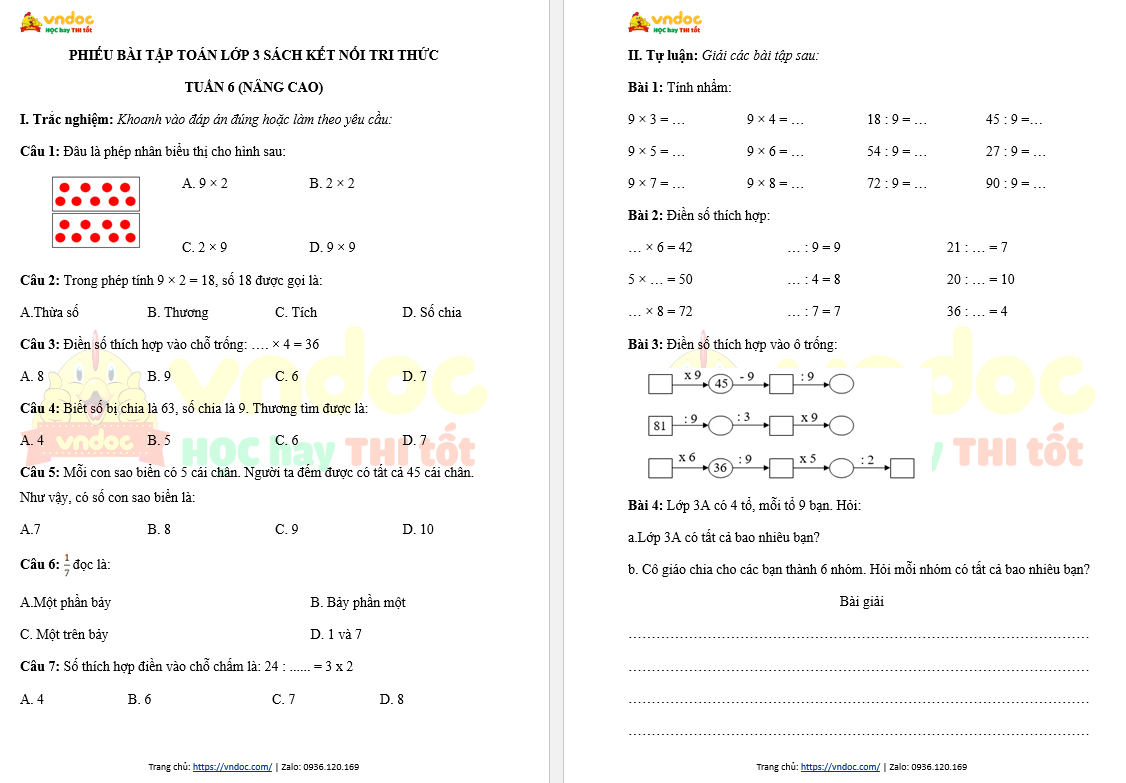 Bài tập cuối tuần Toán lớp 3 Kết nối tri thức - Tuần 6 (nâng cao) do VnDoc biên soạn nhằm giúp các em học sinh ôn tập, tổng hợp lại kiến thức đã học ở tuần 6 chương trình Toán lớp 3 sách Kết nối tri thức với cuộc sống.