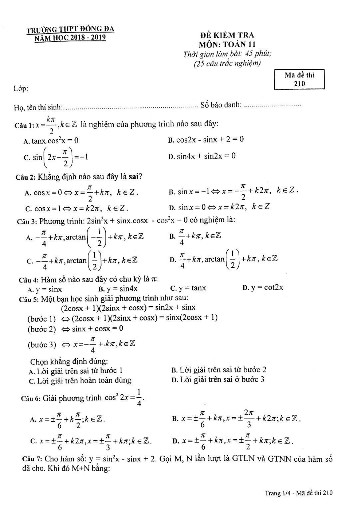 Đề kiểm tra Đại số và Giải tích 11 chương 1 năm 2018 - 2019 trường THPT Đống Đa - Hà Nội