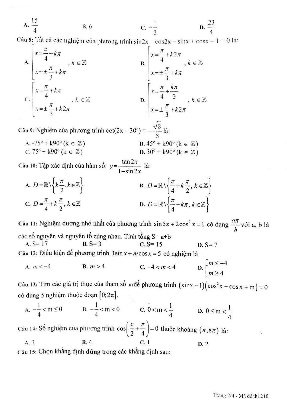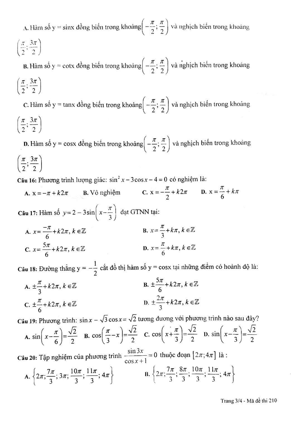 Đề kiểm tra Đại số và Giải tích 11 chương 1 năm 2018 - 2019