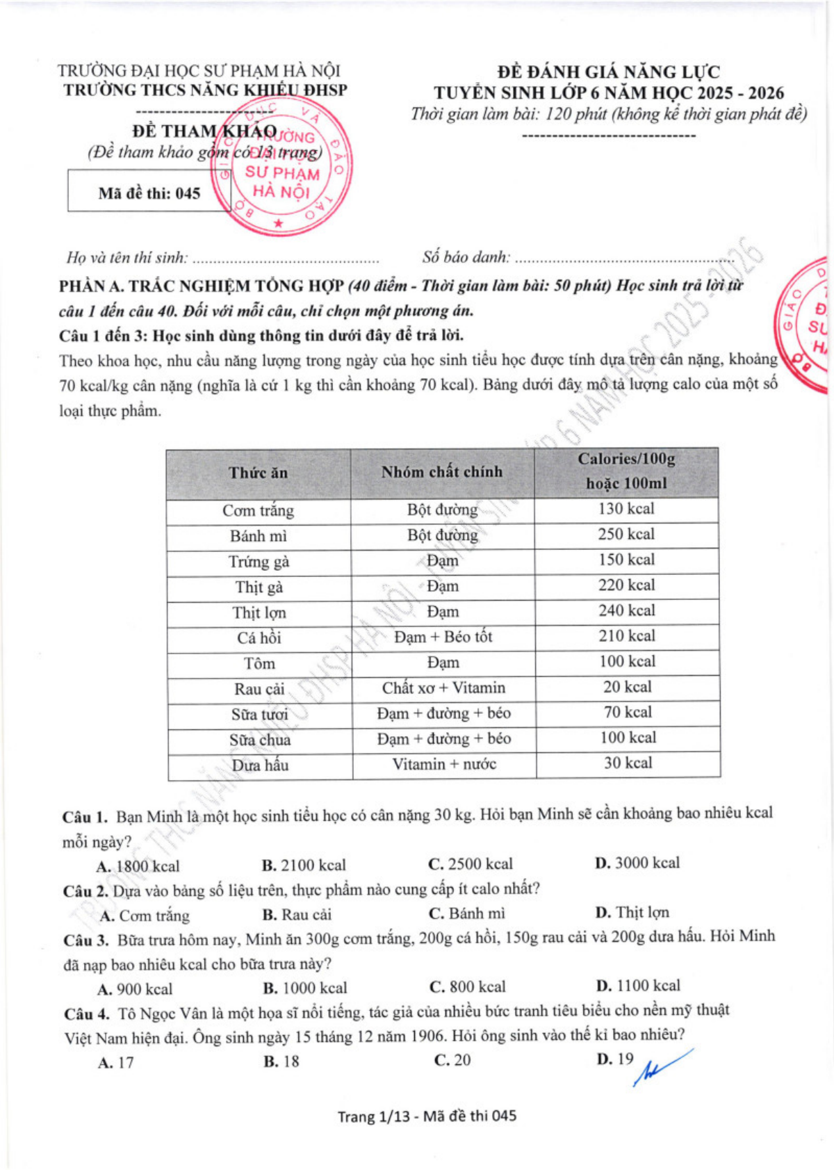 Đề kiểm tra đánh giá năng lực vào lớp 6 trường THCS Năng khiếu Đại học Sư phạm năm 2025 - 2026